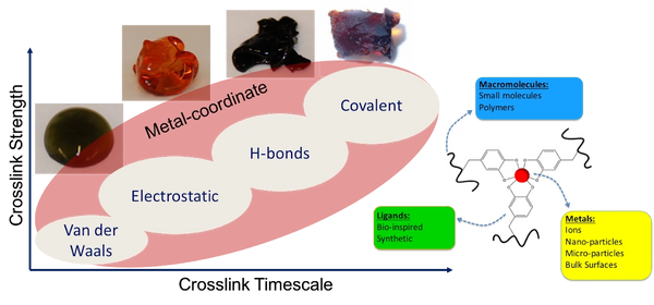Inspired by the self-healing, adhesive and tunable properties of biological material interfaces, we design and characterize molecular material systems for novel uses in medicine, adhesive technology, and metal sequestration.